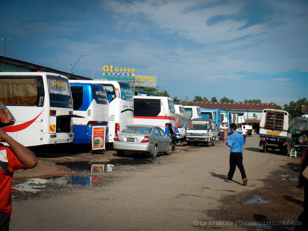 Am nächsten Tag hieß es für uns packen und auf große Inlandsreise gehen. Da die Busse immer so vollgestopft sind und wir sowieso schon eine so lange Busfahrt vor uns hatten, entschieden für uns für eine Taxifahrt zum Bus-Terminal für 6000 Kyatt (ca. $7,00). Am Busterminal staunten wir nicht schlecht als wir hunderte von Bussen auf dem vor Schlamm triefenden riesigen Platz sahen. Drumherum natürlich viele bunte Essens- und Verkaufsbuden. Der Taxifahrer fuhr uns direkt zu unserem Bus (Gott sei Dank, sonst hätten wir den in den Massen nie gefunden) und unser Gepäck wurde sofort vom Buspersonal verstaut. Wir wurden sehr freundlich aufgenommen, auch wenn wir weit und breit die einzigen Touristen zu sein schienen.