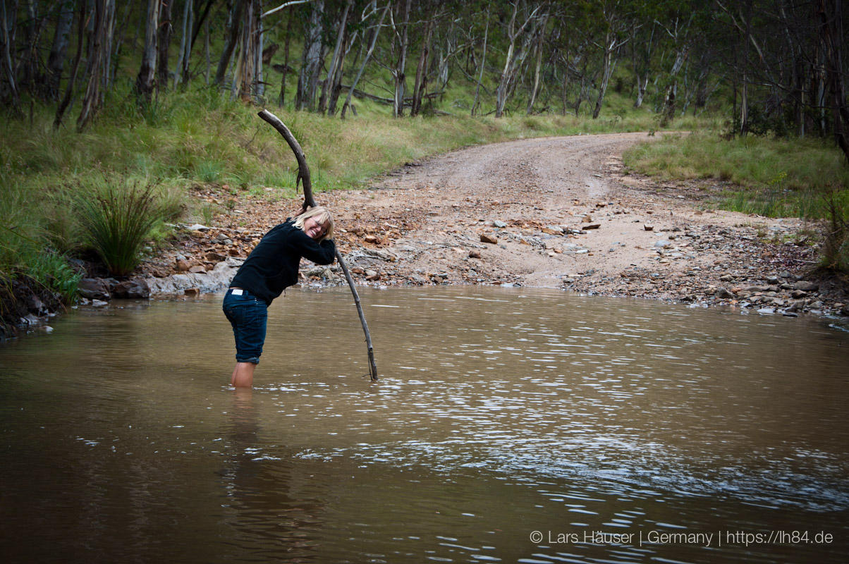 Aus Mangel von Informationszentren unterwegs fuhren wir also in den Deua National Park ohne genaue Karten, einfach mal drauf los. Der im Navi eingegeben Ort „Snowball“ war gar kein Ort, sondern nur eine Kreuzung auf einer Schotterstraße. Wir liessen uns aber nicht beirren und nahmen die doch etwas merkwürdig aussehende Abzweigung in den eigentlich National Park (Geländewagenstrecke). Schon nach wenigen Metern erwartete uns die erste tiefe Flussdurchquerung, dessen Tiefe Yvi erstmal zu Fuss austesten musste.