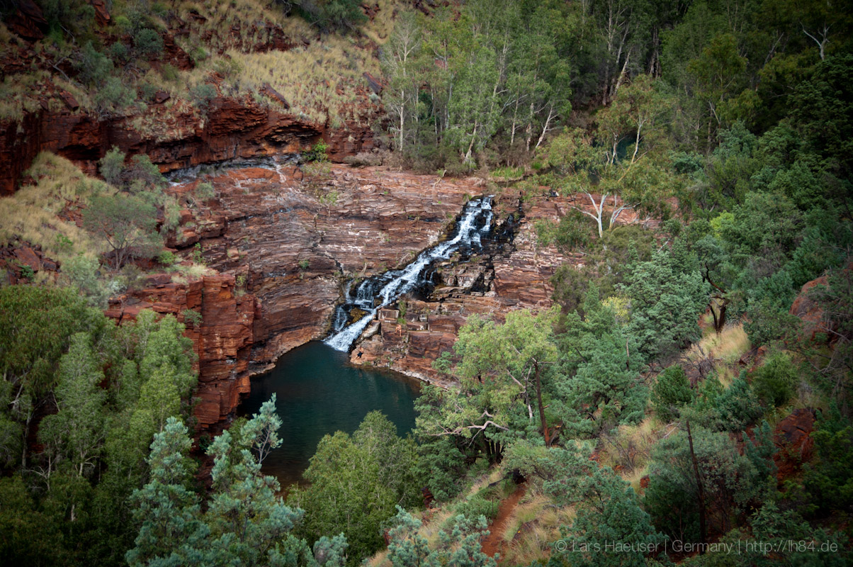 Den nächsten Tag verbrachten wir in der Dales Gorge. Wir genossen ein erfrischendes Bad in den Becken der Fortescue Falls bevor wir die Schlucht erwanderten. Manchmal war es doch recht schwer den Weg zu finden, doch schließlich erreichten wir den wunderbaren Circular Pool, eine kleine Oase inmitten der Felswände. Das Wasser rann den Fels hinunter, sodass man unter einem Felsvorsprung eine natürliche Dusche genießen konnte. Einige Verrückte sprangen von den mehr als fünf Meter hohen Vorsprüngen. Wir hatten jedoch am Tag vorher von einem bösen Unfall gehört und ließen es lieber sein.