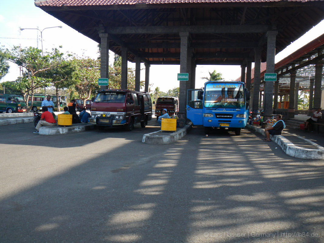 Leider war das darauf folgende Essen von McDonalds doch nicht so verträglich wie erhofft und Yvi besuchte die schäbige Hoteltoilette mindestens 20 Mal in der darauf folgenden Nacht. Allerdings war es für uns keine Option länger in dieser lauten und hässlichen Stadt und in diesem versifften Hotel zu bleiben. Außerdem hatten wir schon Bustickets nach Gilimanuk gekauft. Aus diesem Grund ging es mit Hilfe von genug Tabletten auf die geplante vierstündige Busfahrt nach Gilimanuk für 55.000 IDR (ca. $5,50) pro Person. Im Gegensatz zum Bemo scheint der Preis hier einigermaßen “festgelegt” zu sein, wobei man aber doppelt bezahlt, wenn man viel Gepäck bei sich hat. Der Bus hatte dem Anblick nach zu urteilen schon einige Jahrzehnte oder vielleicht sogar einen Brand hinter sich. Der ganze Bau war vollkommen durchgerostet und bei jedem Schlagloch hatte man das Gefühl, dass alle Fenster gleichzeitig herausfallen würden. Gott sei Dank ist nichts passiert und wir kamen nach zirka fünf Stunden wohlbehalten in Gilimanuk auf Bali an. Leider gefiel uns das Dorf nicht wirklich gut und die Übernachtungsmöglichkeiten ließen auch zu wünschen übrig. Direkt nach Java wollten wir aber auch nicht, da wir noch einen Schnorchel-Trip zur Pulau (Insel) Menjangan geplant hatten.